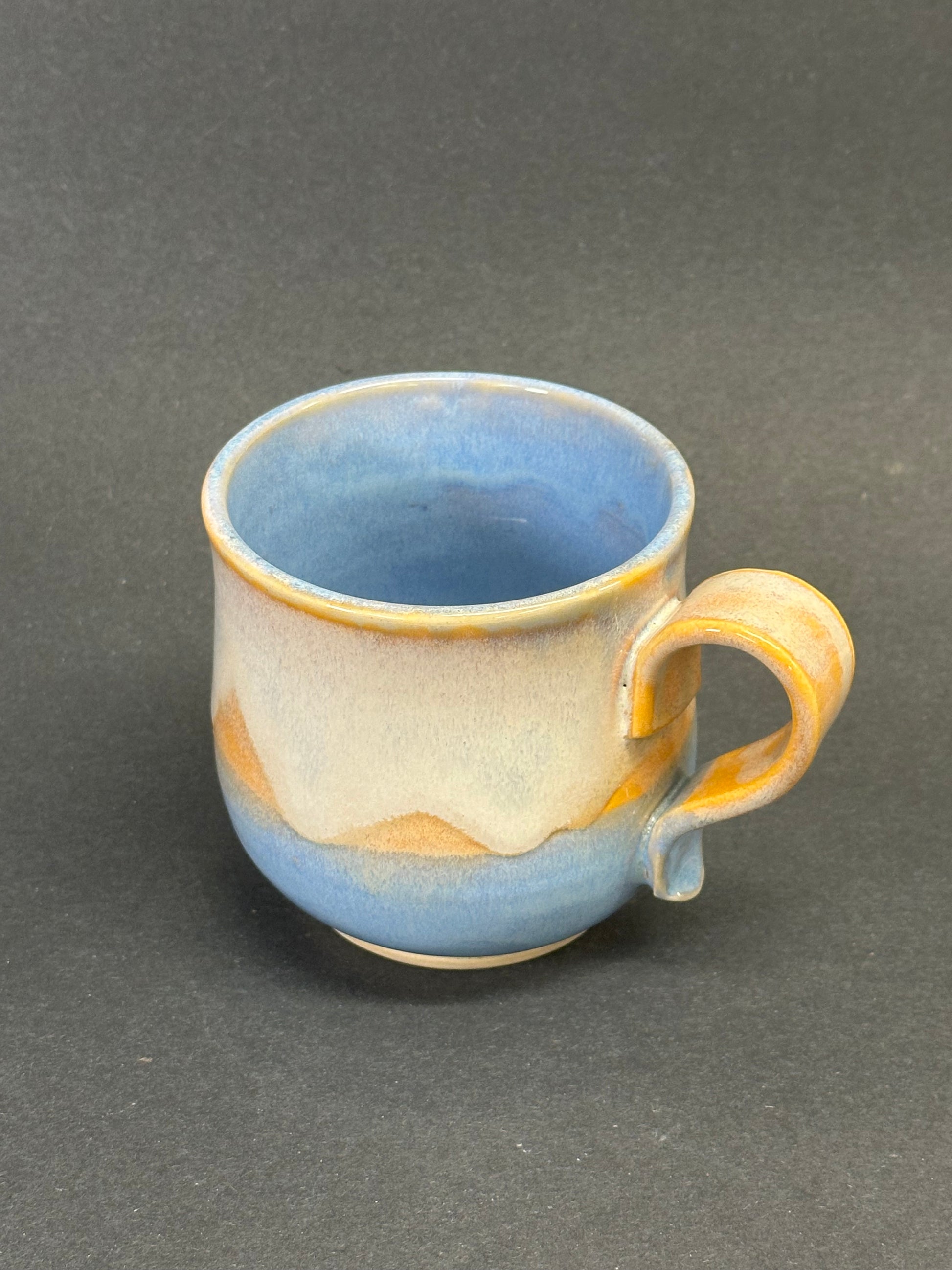 Handthrown and trimmed on the wheel. Hand-pulled handle added. Glazed in four different glazes to create beautiful cascading orange effect on the outside. Periwinkle blue inside.