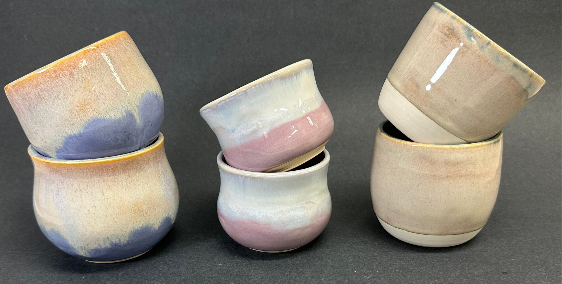 Celadon green glaze on the inside. Cascading creamy orange blends into lavender on the outside.