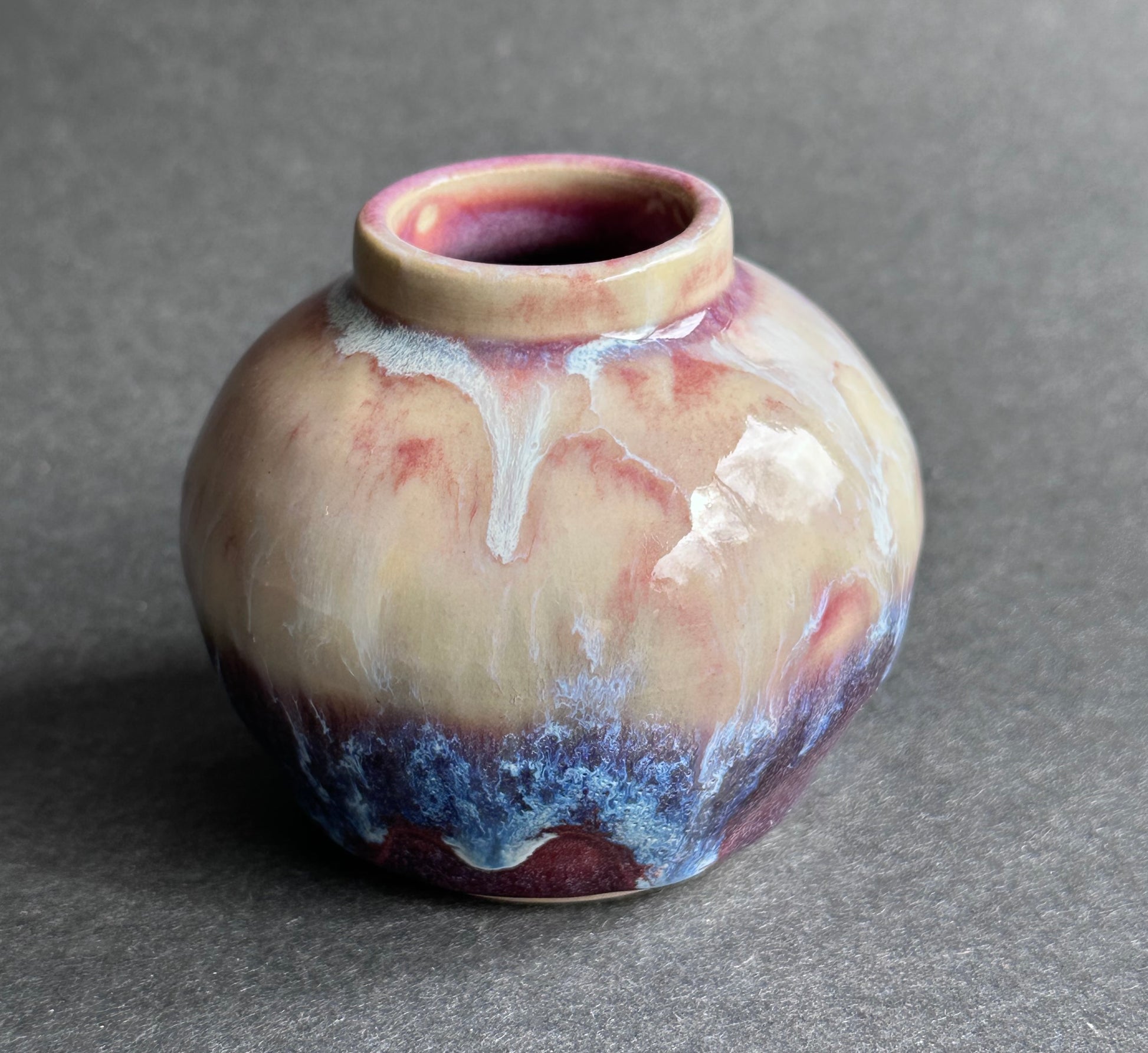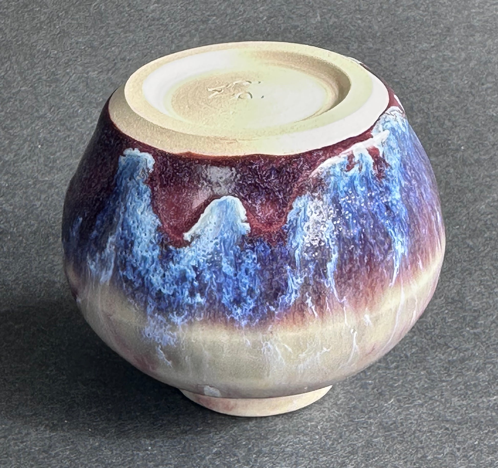 Glazed in cascading purple-blue with highlights of cream and fuschia.